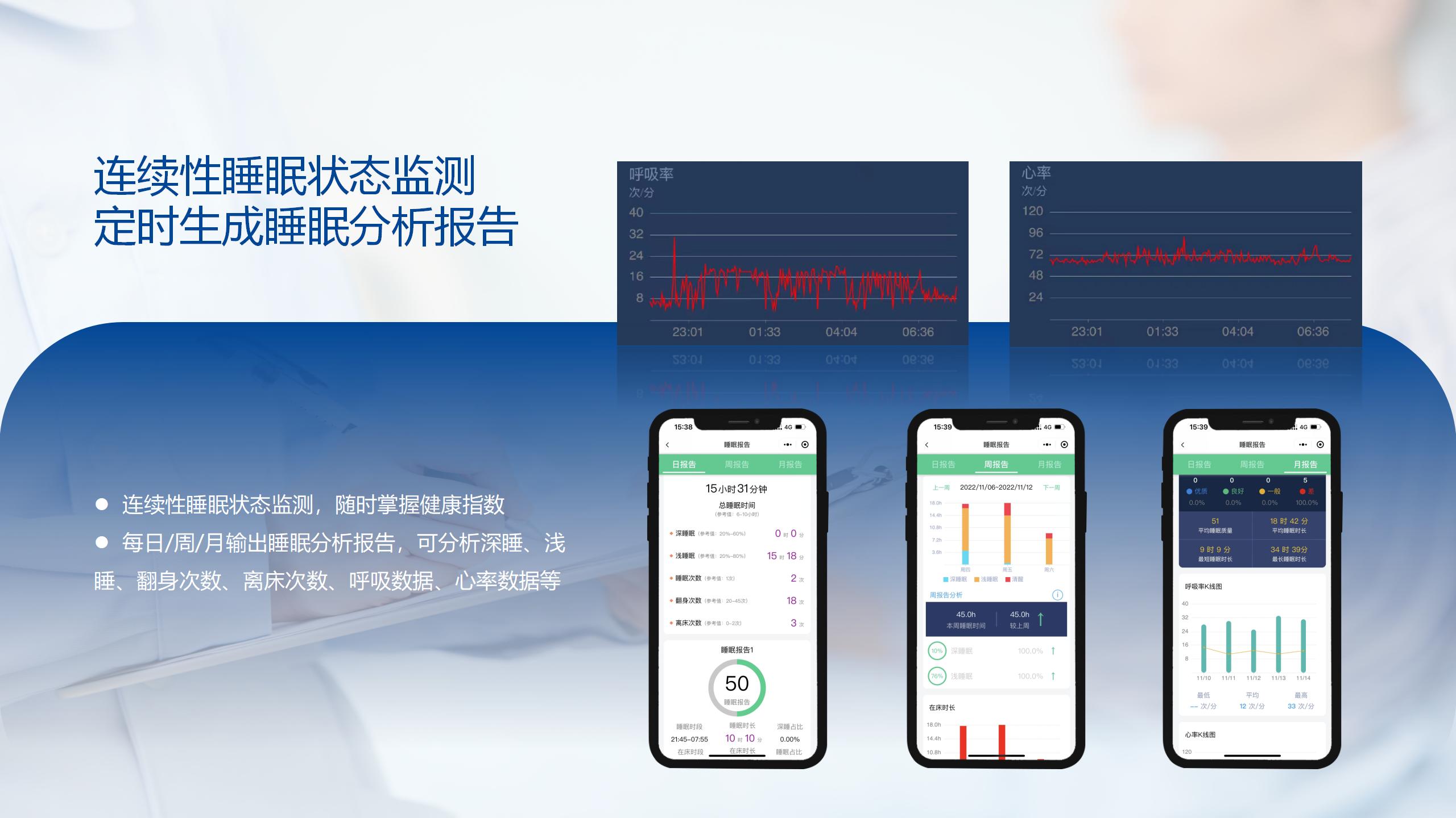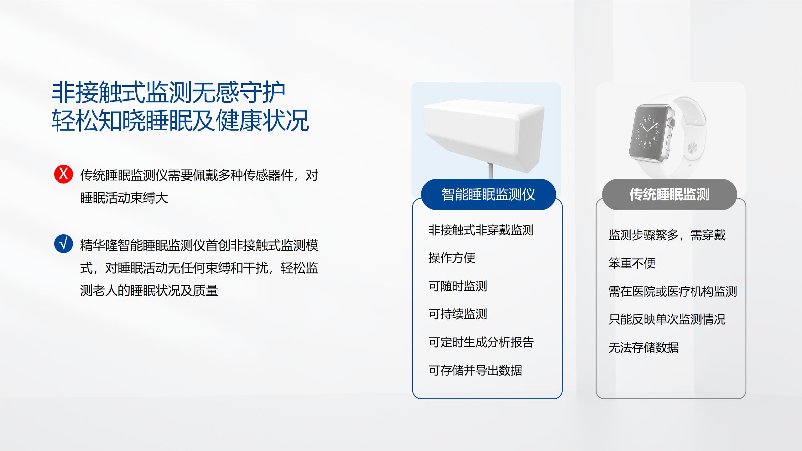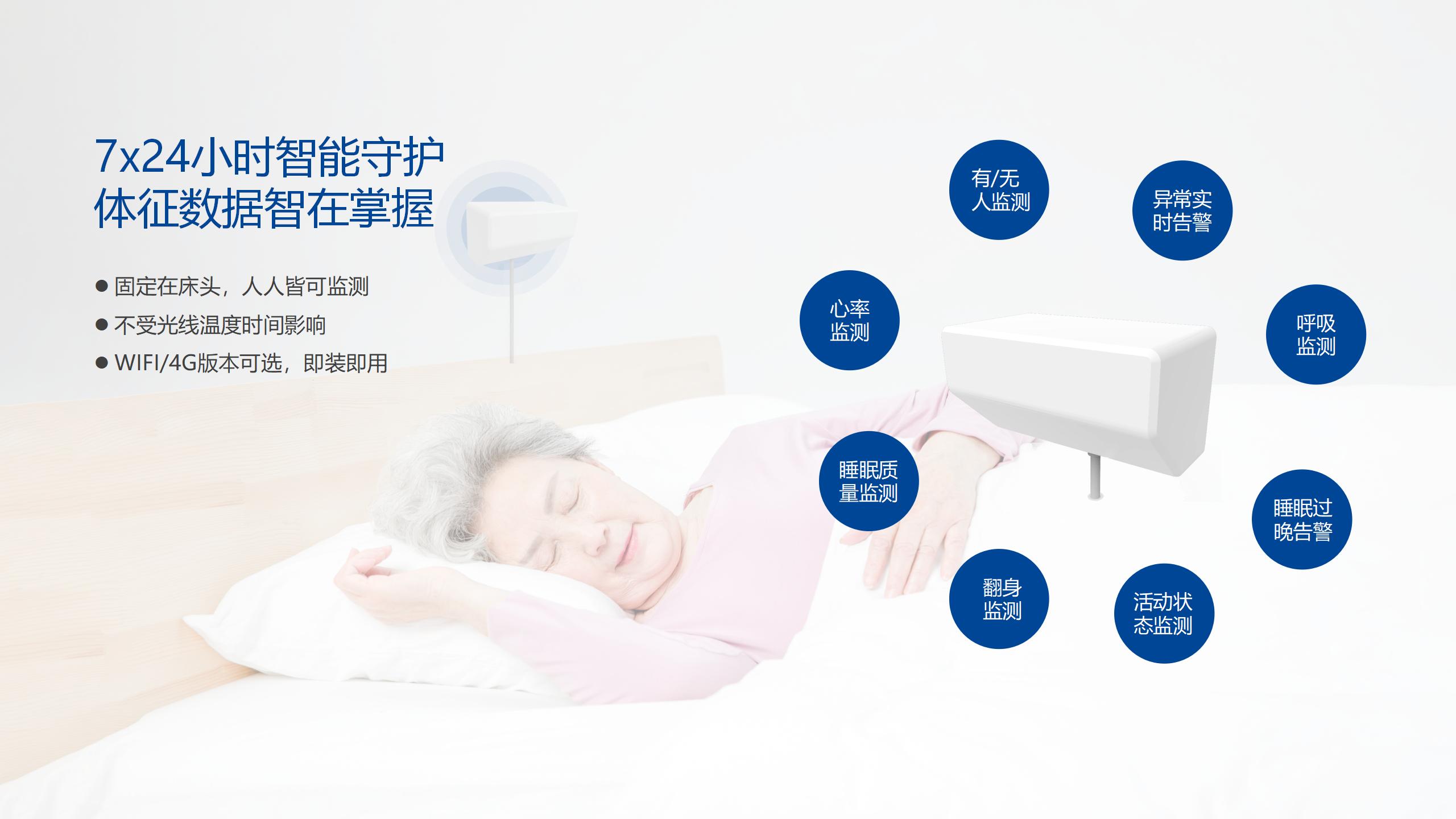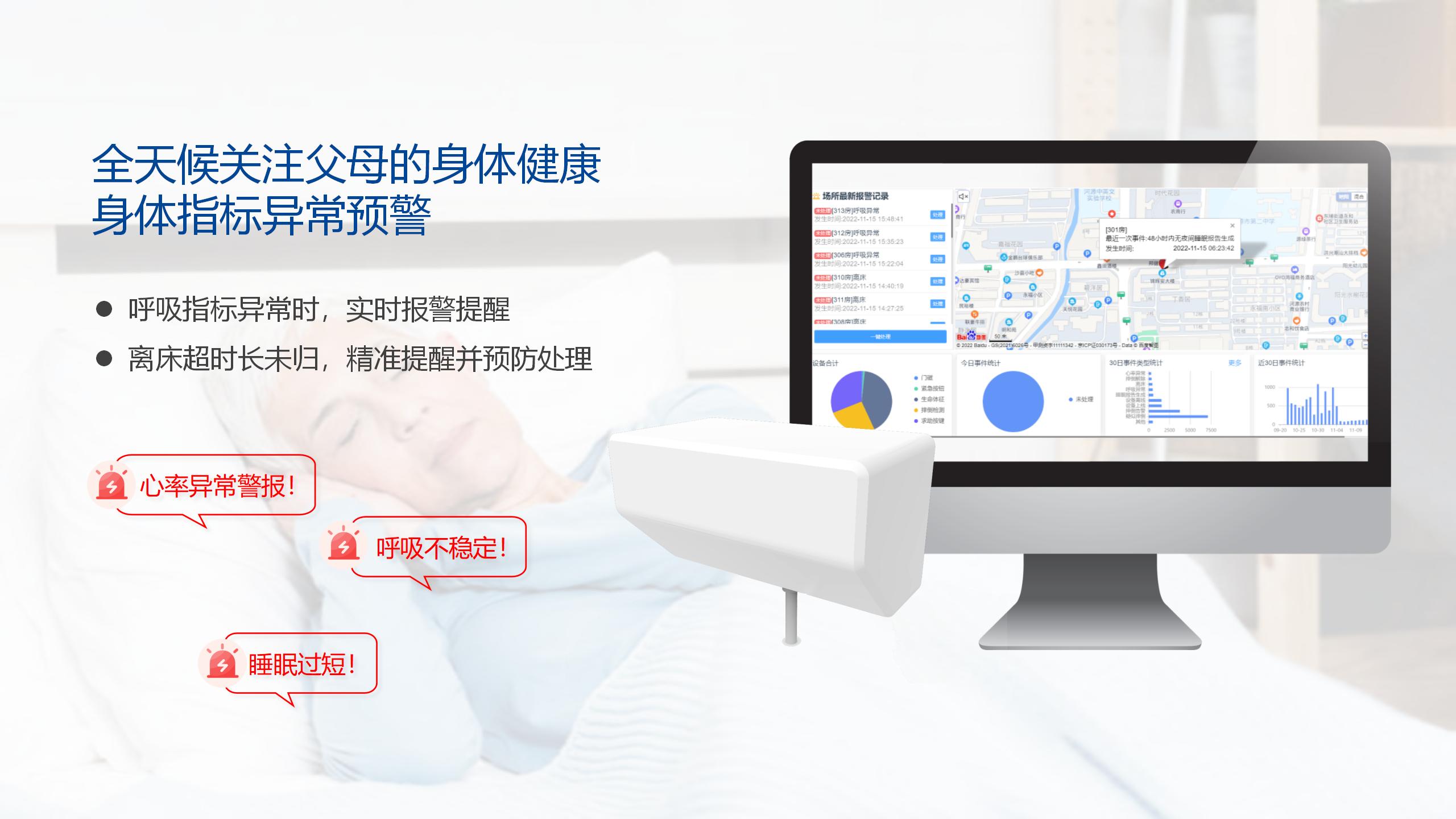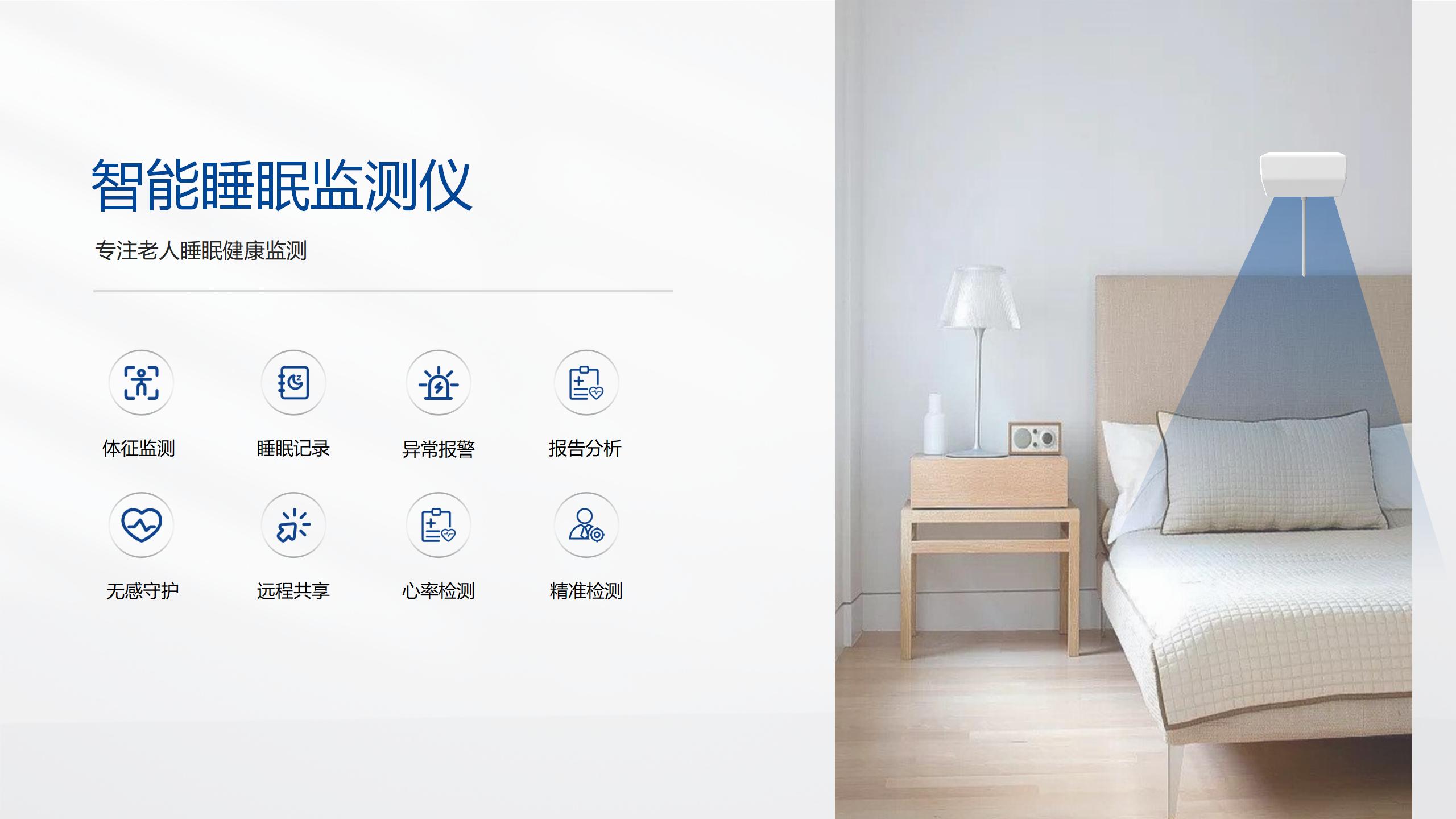 通過精華隆自主研發的毫米波雷達技術及算法,智能睡眠監測儀在不侵犯隱私的前提下采集長者的日常活動數據,進行睡眠質量分析、生命體征評估、呼吸慢病AI輔助診療等功能,幫助長者制定科學合理的生活規律。